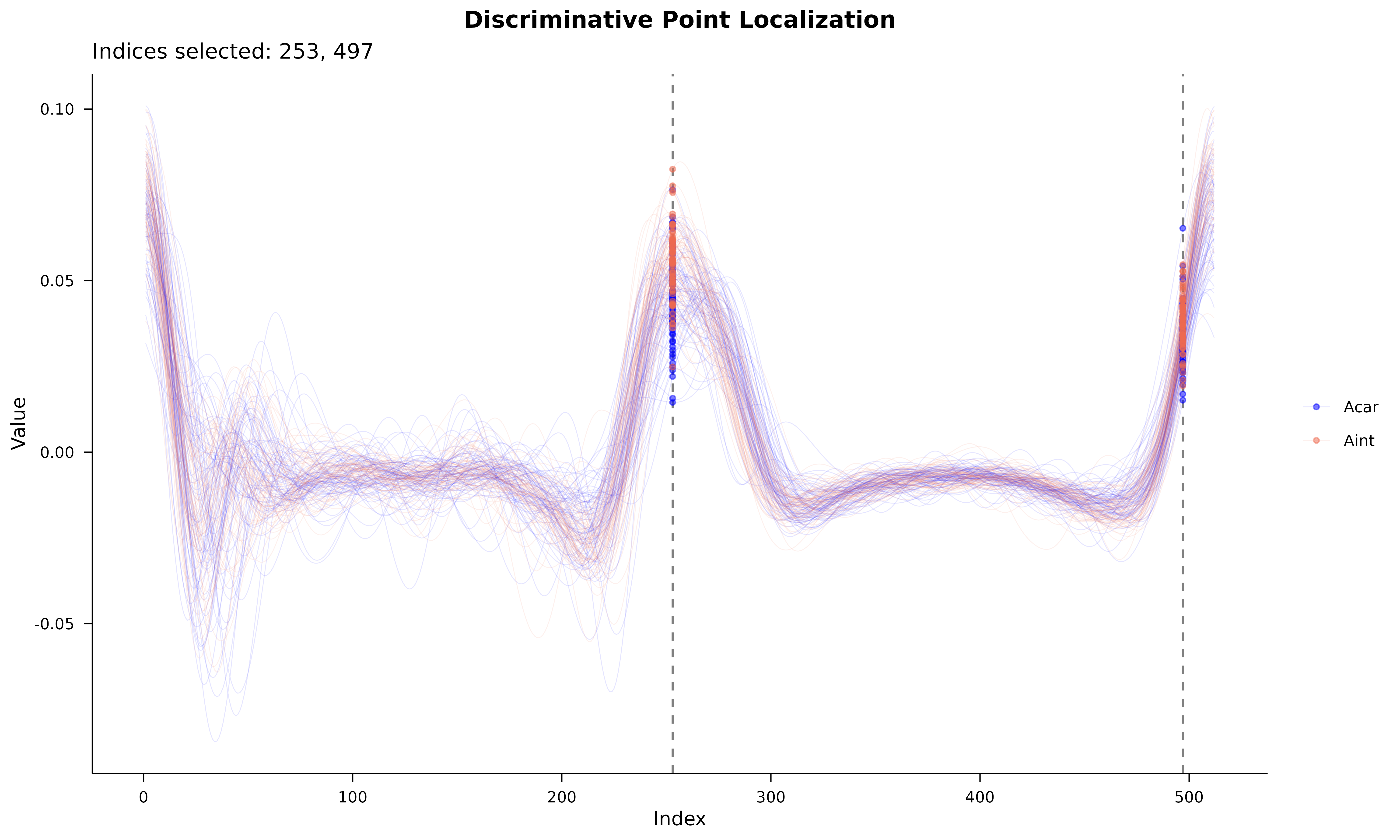 In shape analysis, we often end up with high-dimensional functional data, such as wavelet coefficients or radial distances. Identifying which points on these curves are most discriminative for classification is a common challenge. This tutorial illustrates how to use the Hall & Bathia (2012) algorithm to sequentially select the best points to maximize classification accuracy.